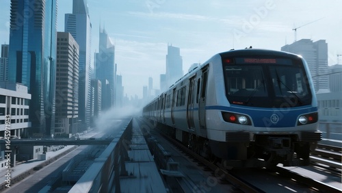 Naklejka premium A modern metro train travels through a bustling city skyline with tall...