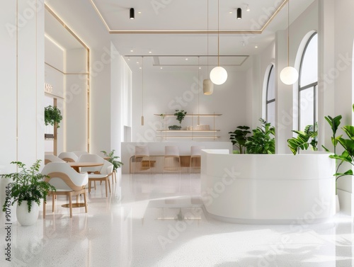 © wpw, Fototapeta premium A modern minimalist café featuring quick service, clean lines, and a calm setting with streamlined design.