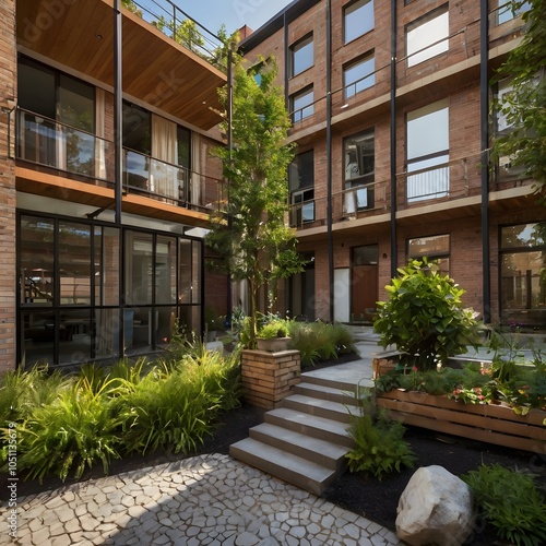 Obraz premium A modern, minimalist courtyard garden with brick buildings and lush greenery.