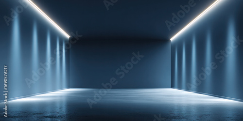 Fototapeta premium A modern minimalist empty room with blue strip lighting on walls and ceiling,...