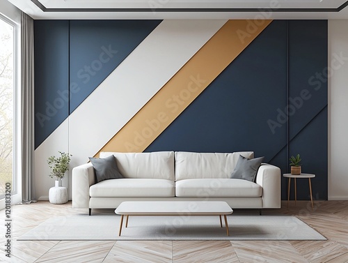 © Trendistudio, Fototapeta premium A modern minimalist interior design of a residential living room with blue, gray, brown panels to finish the walls and white sofas. Generative AI