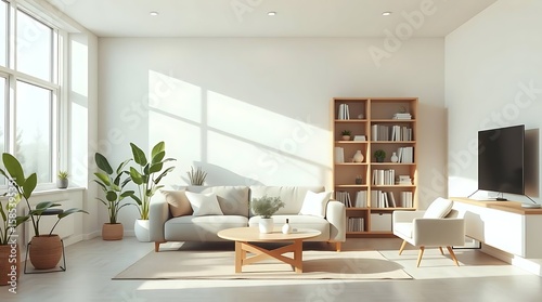 Fototapeta premium A modern minimalist living room interior with sofa, coffee table, indoor plants, bookshelf, and large window, flat vector style, neutral tones, clean design
