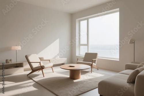 Fototapeta premium A modern minimalist living room with large window, comfortable sofa, chairs, coffee table, and soft lighting, creating a cozy and serene atmosphere.