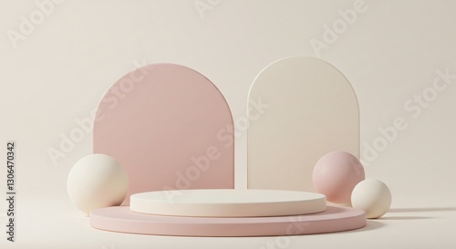 Fototapeta premium A modern, minimalist podium with soft pink and cream tones, rounded arches, and floating spheres, creating a stylish and elegant backdrop perfect for product display and branding.