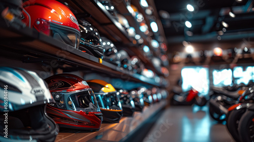 © DreamyStudio, Fototapeta premium A modern motorcycle prominently displayed in a showroom, highlighted by meticulous design and surrounded by an array of helmets
