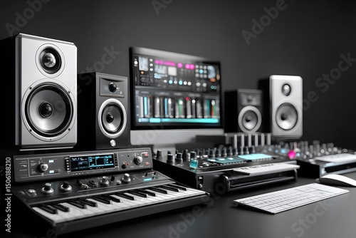 Obraz premium A modern music production setup featuring various audio equipment, including...