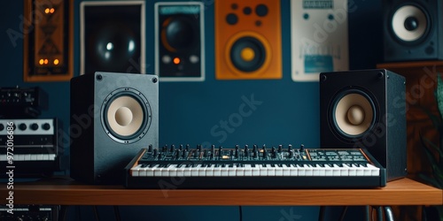 Obraz premium A modern music studio setup featuring a synthesizer and loudspeakers against...