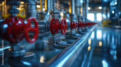 © Iurii, Fototapeta premium A modern network of clean and polished pipelines with red valves in an industrial setting