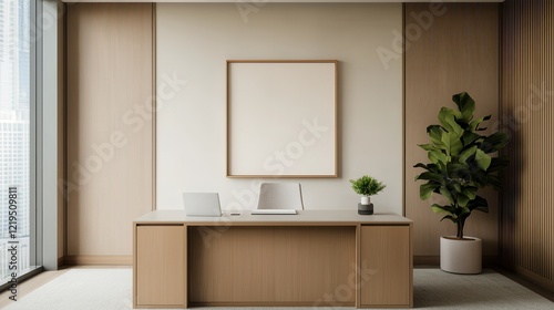 © Noppakun, Fototapeta premium A modern office interior featuring minimalist conceptual imagery, a wooden desk, empty frames, and a decorative plant by the window.