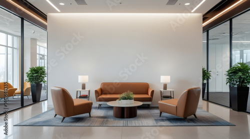 © RT Studio 1981, Fototapeta premium A modern office lobby with a cozy seating area featuring a brown sofa and two matching armchairs around a round coffee table.