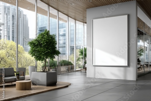 Fototapeta premium A modern office space featuring large windows, a minimalist design, and green...