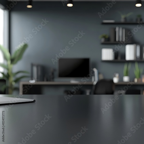 © Badass Prodigy, Obraz premium A modern office workspace featuring a desk, computer, and plants in a minimalist design.