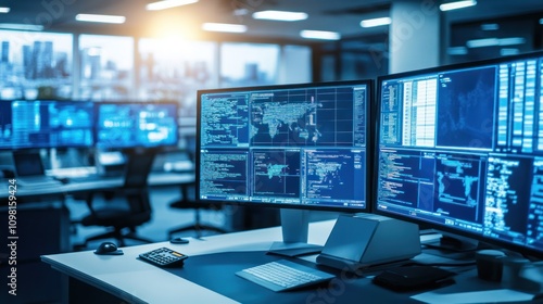 Naklejka premium A modern office workspace with multiple monitors displaying data and analytics.