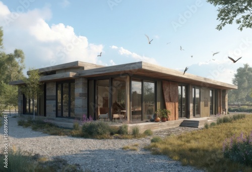 © LucieAliceNova, Obraz premium A Modern One-Story House with a Cozy and Elegant Atmosphere