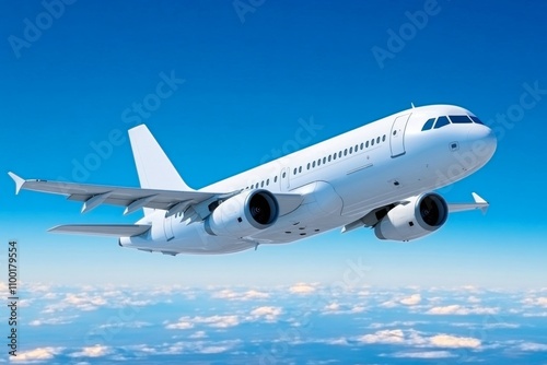© Thanyarat, Obraz premium A modern passenger airplane taking off into a clear blue sky, with sunlight glinting off its wings