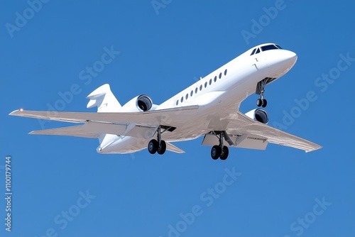 © Thanyarat, Obraz premium A modern passenger airplane taking off into a clear blue sky, with sunlight glinting off its wings