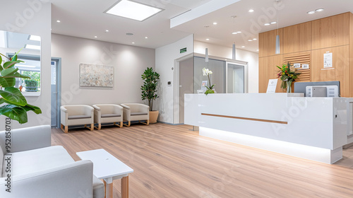 © Luluraschi, Fototapeta premium a modern physiotherapy clinic interior, showcasing clean lines, state-of-the-art equipment, and a welcoming reception area.