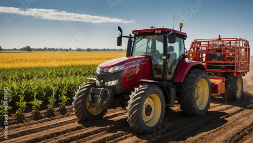 Fototapeta premium A modern red tractor working in the crops field.