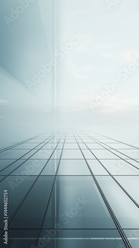 © Aris Suwanmalee, Obraz premium A modern, reflective facade with a clear sky backdrop and geometric patterns.