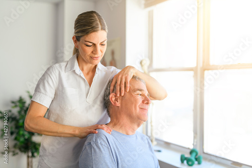Fototapeta premium A Modern rehabilitation physiotherapy worker with senior client