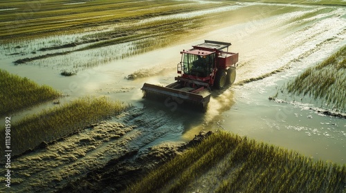 © Nicoum, Fototapeta premium A modern rice harvester moves steadily across the flooded fields, cutting the rice plants with surgical precision.