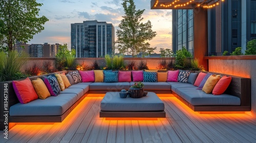 © GoDress, Obraz premium A modern rooftop patio with a large sectional sofa, colorful pillows, and ambient lighting.