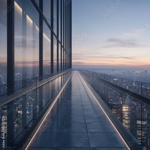 Obraz premium A modern sky bridge with glass panels and sleek railings connecting two buildings with stunning aerial views of the city below