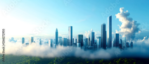 Fototapeta premium A modern skyline emerges through clouds, showcasing tall skyscrapers against a bright blue sky, symbolizing urban development and innovation.