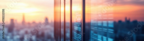 Fototapeta premium A modern skyscraper reflecting the vibrant colors of sunset over a bustling...