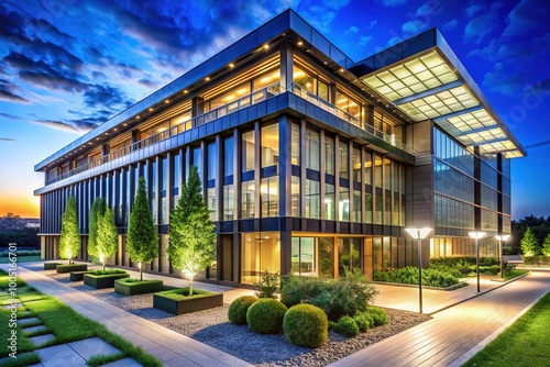 Fototapeta premium A modern, sleek, and sustainable office building with energy-efficient LED lights, solar panels, and greenery, exemplifying eco-friendly commercial architecture and renewable energy solutions.