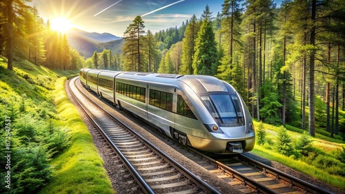 © Adisorn, Naklejka premium A modern sleek commuter train with silver bullet-shaped cars and curved windows speeds through a lush green forest on a sunny day.