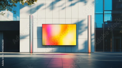 Fototapeta premium a modern, sleek facade of a building with a large, flat-screen television placed directly on the ground, its screen displaying a vibrant, high-contrast image, surrounded by two thin, tall, vertically-