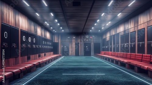 © Chotijah, Obraz premium A Modern Sports Team Locker Room with Green Artificial Turf