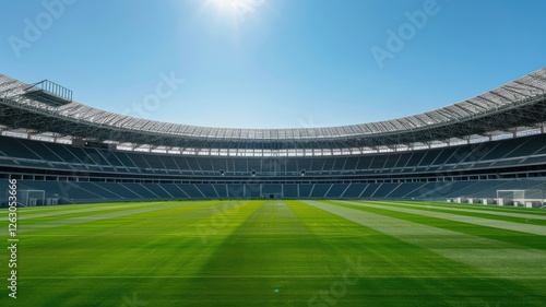 Naklejka premium A modern stadium under a clear blue sky, featuring a lush green field and...