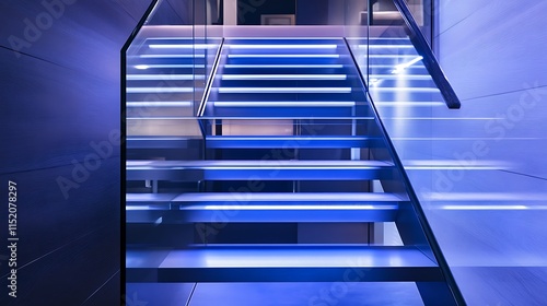 Obraz premium A modern staircase illuminated with blue light, creating a sleek and...