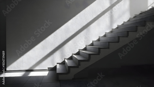 Obraz premium A modern staircase wall catching intense sunlight producing long sharp-edged...