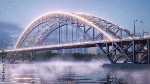 Naklejka premium A modern steel arch bridge illuminated at night, mist rising from the water...