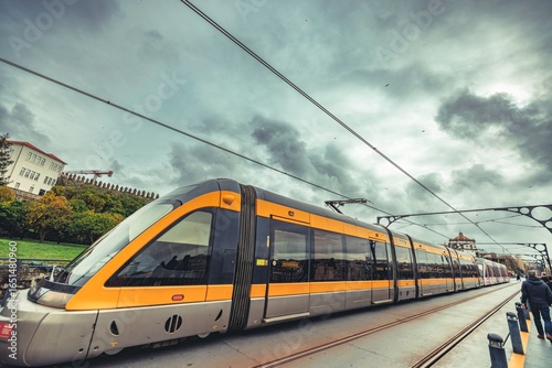 © Damian, Naklejka premium A modern, streamlined tramcar in yellow and gray is moving along the tracks. Overcast skies hang above, with city buildings and people visible in the background of Porto