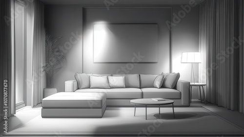 Fototapeta premium A modern, stylish living room featuring a light sofa, coffee table, and soft...