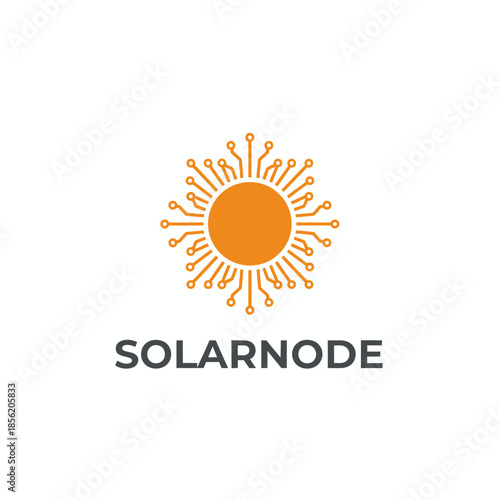 © MISHB, Fototapeta premium A modern tech logo featuring an orange sun with rays designed as digital circuit nodes. The brand name "SOLARNODE" is in bold, gray typography
