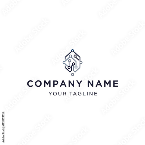 Fototapeta premium A modern technology logo featuring a hexagonal circuit design with nodes and connections, suitable for a tech company.