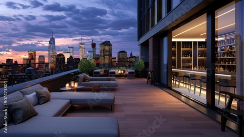 © Muhammad, Obraz premium A modern terrace lounge with a stylish bar area, comfortable daybeds, and a stunning view of a vibrant city skyline at dusk.