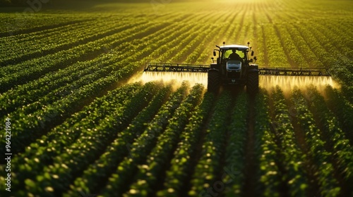© W. Thienthongthai, Fototapeta premium A modern tractor spraying chemicals on a lush green field.