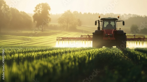 © W. Thienthongthai, Fototapeta premium A modern tractor spraying chemicals on a lush green field.