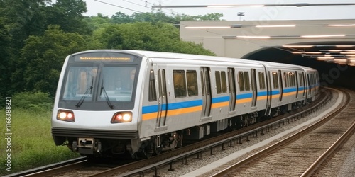 © Iswanto, Fototapeta premium A modern train approaches a tunnel on a curved track surrounded by greenery.