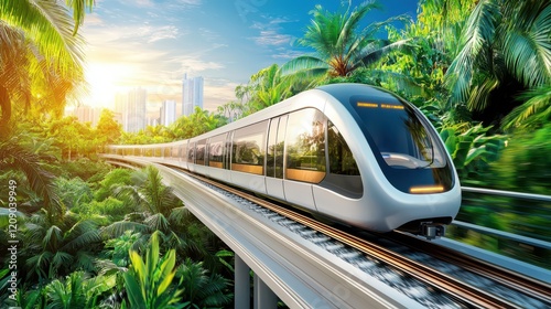 Naklejka premium A modern train speeding along a track, surrounded by lush greenery and a...