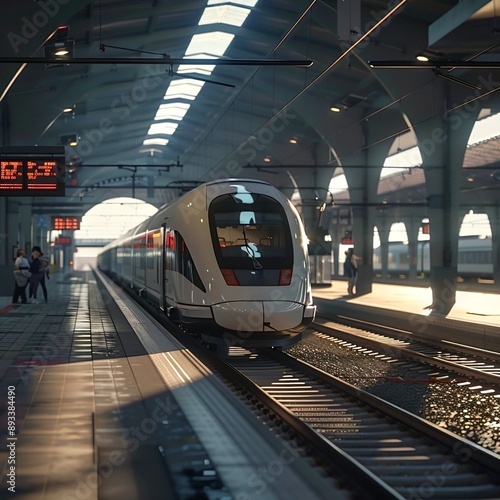 © Sergii, Fototapeta premium A modern train station in the golden hour with high-speed trains and geometric architecture