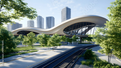Naklejka premium A modern train station with a sleek, wavy roof design, surrounded by greenery and urban buildings, showcasing a blend of architecture and nature