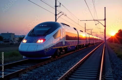 Naklejka premium A modern train travels along a railway during sunset.