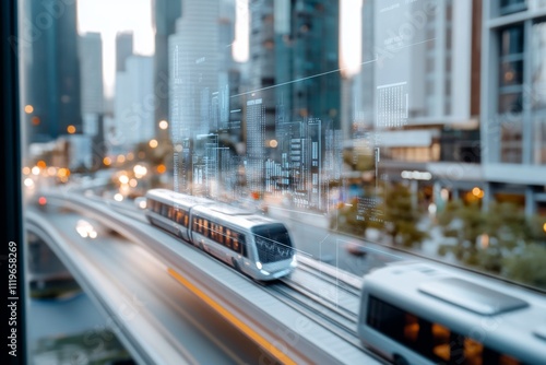 Fototapeta premium A modern tram swiftly travels through a bustling cityscape, digital overlays highlighting the integration of technology and movement.
